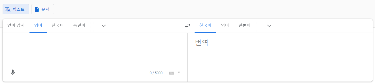 구글 번역기는 정말 간하게 구성되어 있는데 텍스트를 입력할 수 있는 창, 번역될 창 두가지 창이 있습니다.