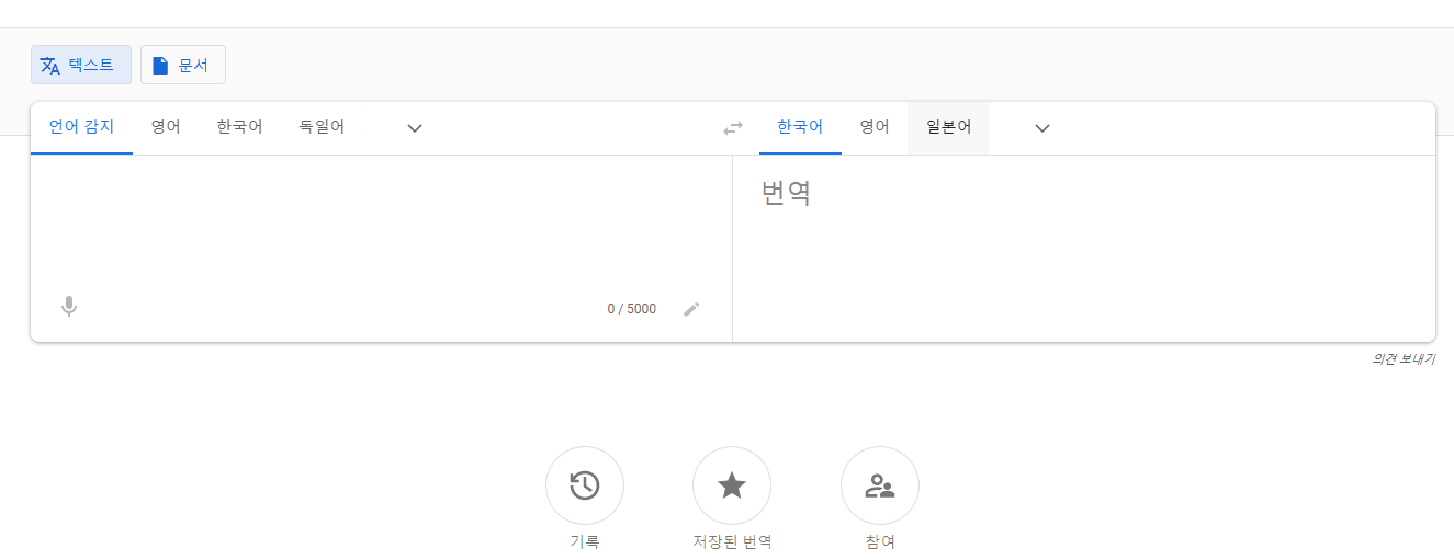 구글 번역기는 정말 간하게 구성되어 있는데 텍스트를 입력할 수 있는 창, 번역될 창 두가지 창이 있습니다.