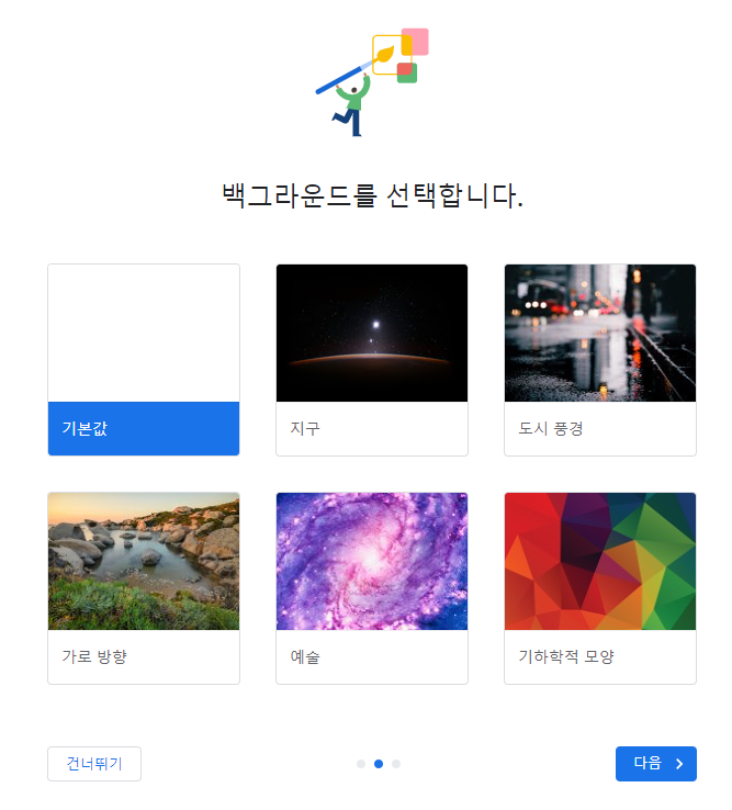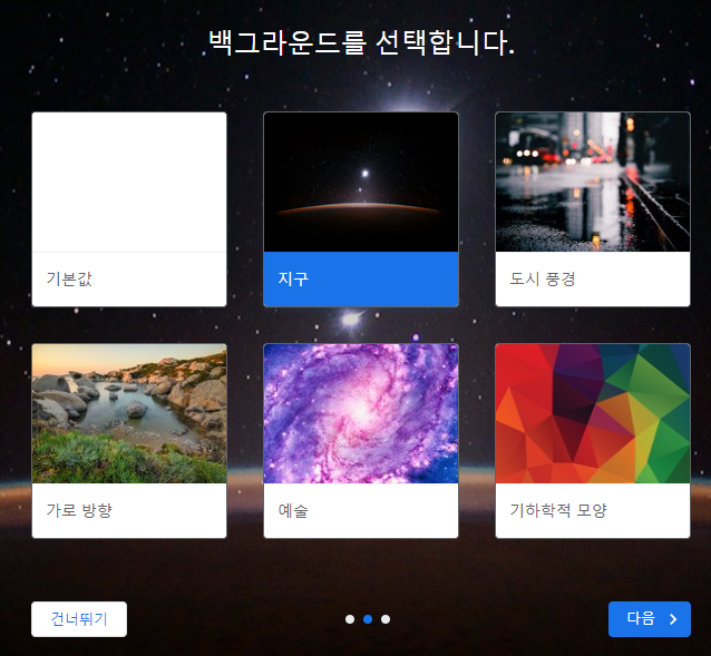 건너뛰기를 클릭하시면 이제 백그라운드를 선택하는 창이 나옵니다.