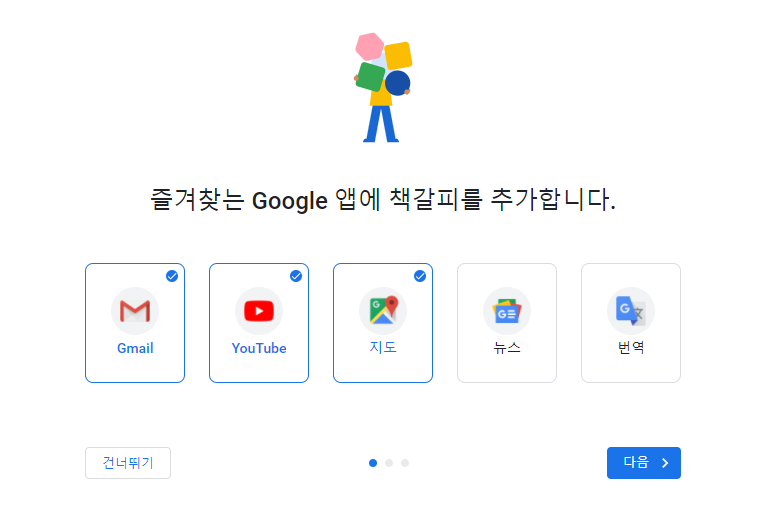 굳이 안하셔도 된다면 전부 해제를 하신 후 왼쪽 아래에 있는 건너뛰기를 클릭하시면 됩니다.