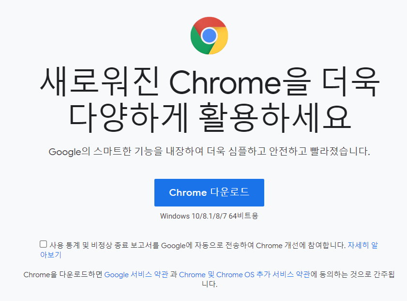 화면중앙에 크롬 다운로드 버튼이 바로 보이는데 아래 쪽에 설명을 보시면 윈도우 10,/8.1/8/7 64비트용이라고 되어 있습니다.