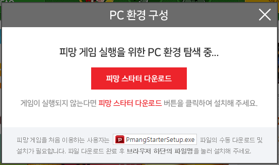 피망 스타터 다운로드를 클릭하셔서 스타터 설치를 먼저 하셔야 하는데 만약에 위화면이나오지 않는다면 아래쪽에 파일을 수동으로 다운로드 받으셔서 설치를 하시면 됩니다.