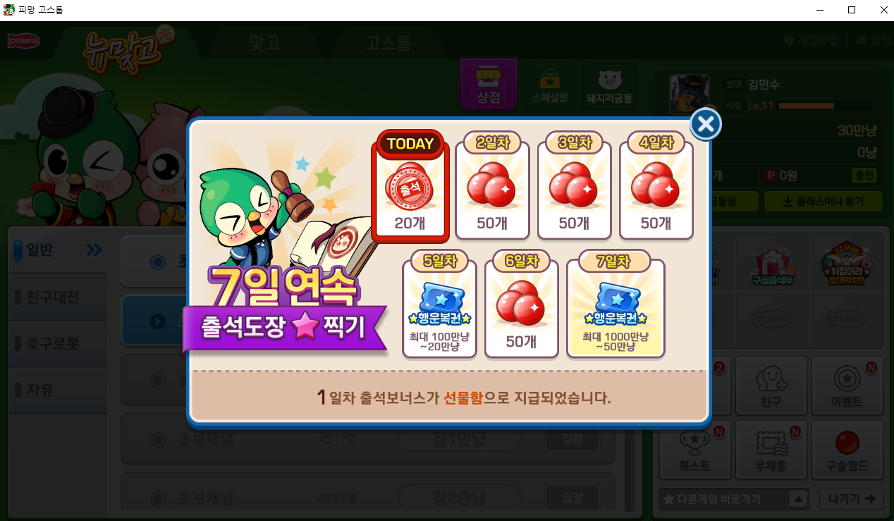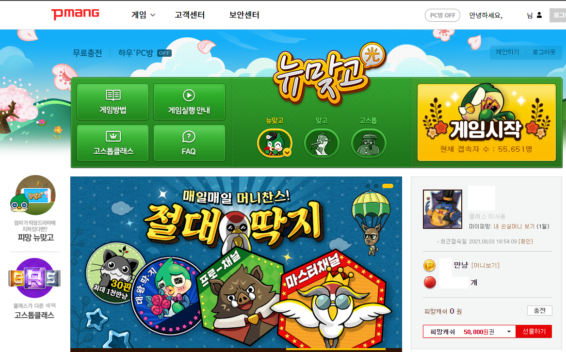 로그인을 하시면 드디어 피망 뉴맞고 홈페이지로 접속이 됩니다.