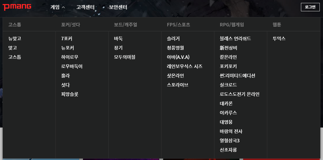 위쪽에 게임, 고객센터, 보안센터가 보이는데 피망 뉴맞고 홈페이지에 접속하시려면 게임 메뉴를 이용하셔야 합니다.