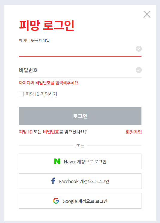 회원이 아니라면 회원가입 버튼을 클릭하셔서 회원가입을 하시면 되고 아니면 구글이나 페이스북 계정을 이용해서 로그인을 하시면 됩니다.