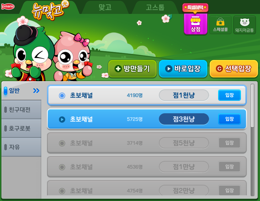 아무 채널에 들어가셔서 뉴맞고를 즐기시면 됩니다.